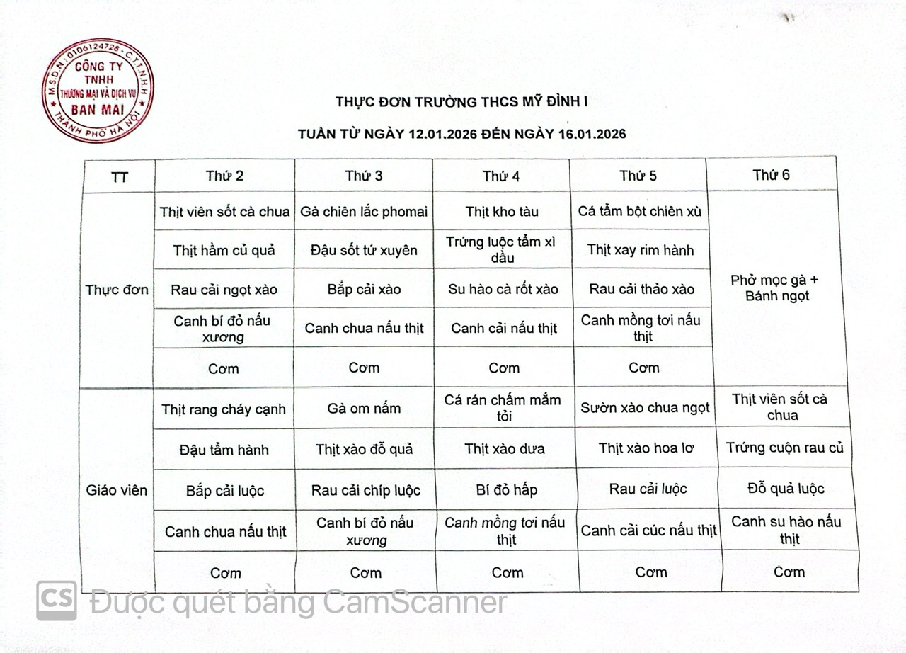 Thực đơn bán trú từ ngày 12/1/2026 đến ngày 16/1/2026