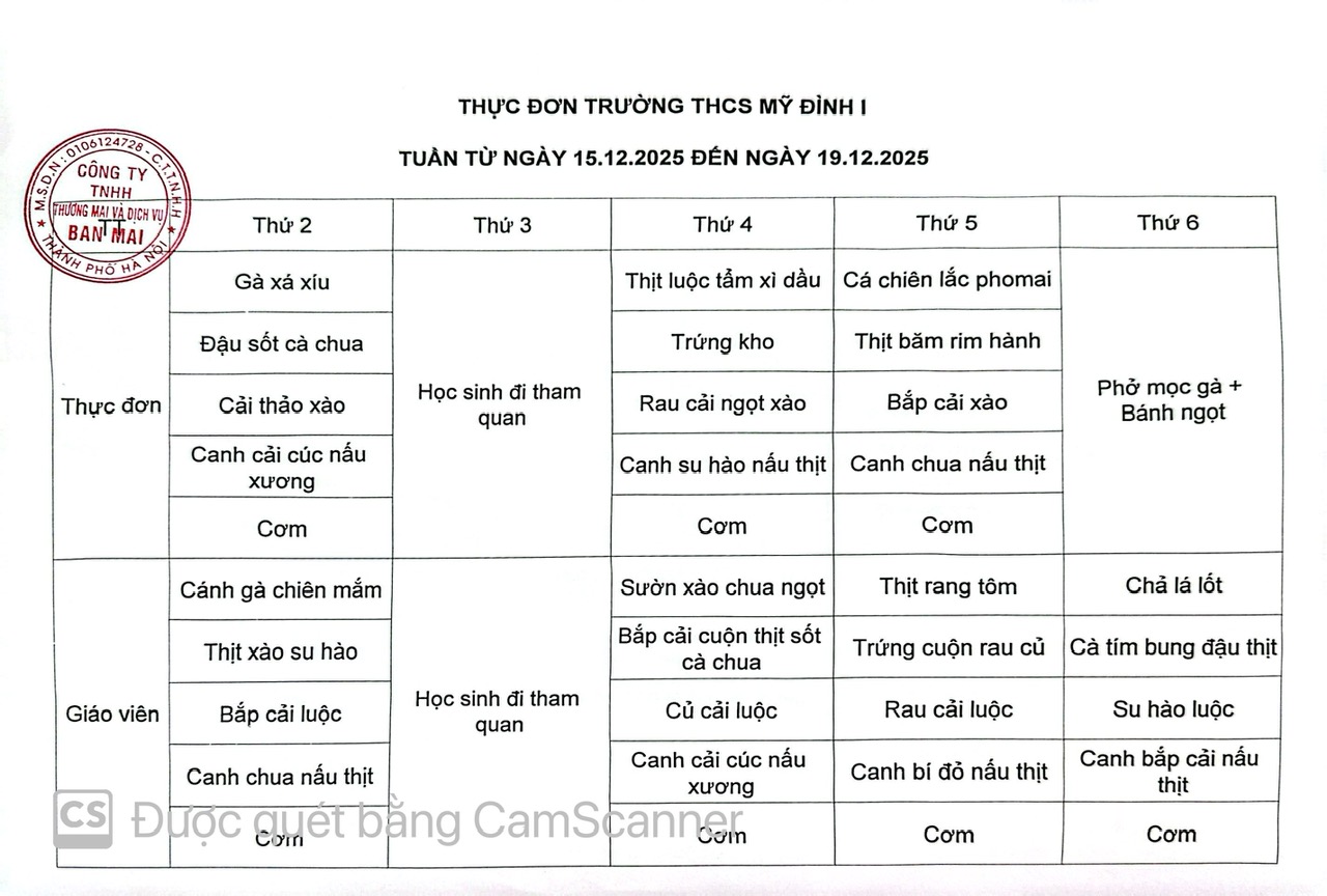 Thực đơn bán trú từ ngày 15/12/2025 đến ngày 19/12/2025