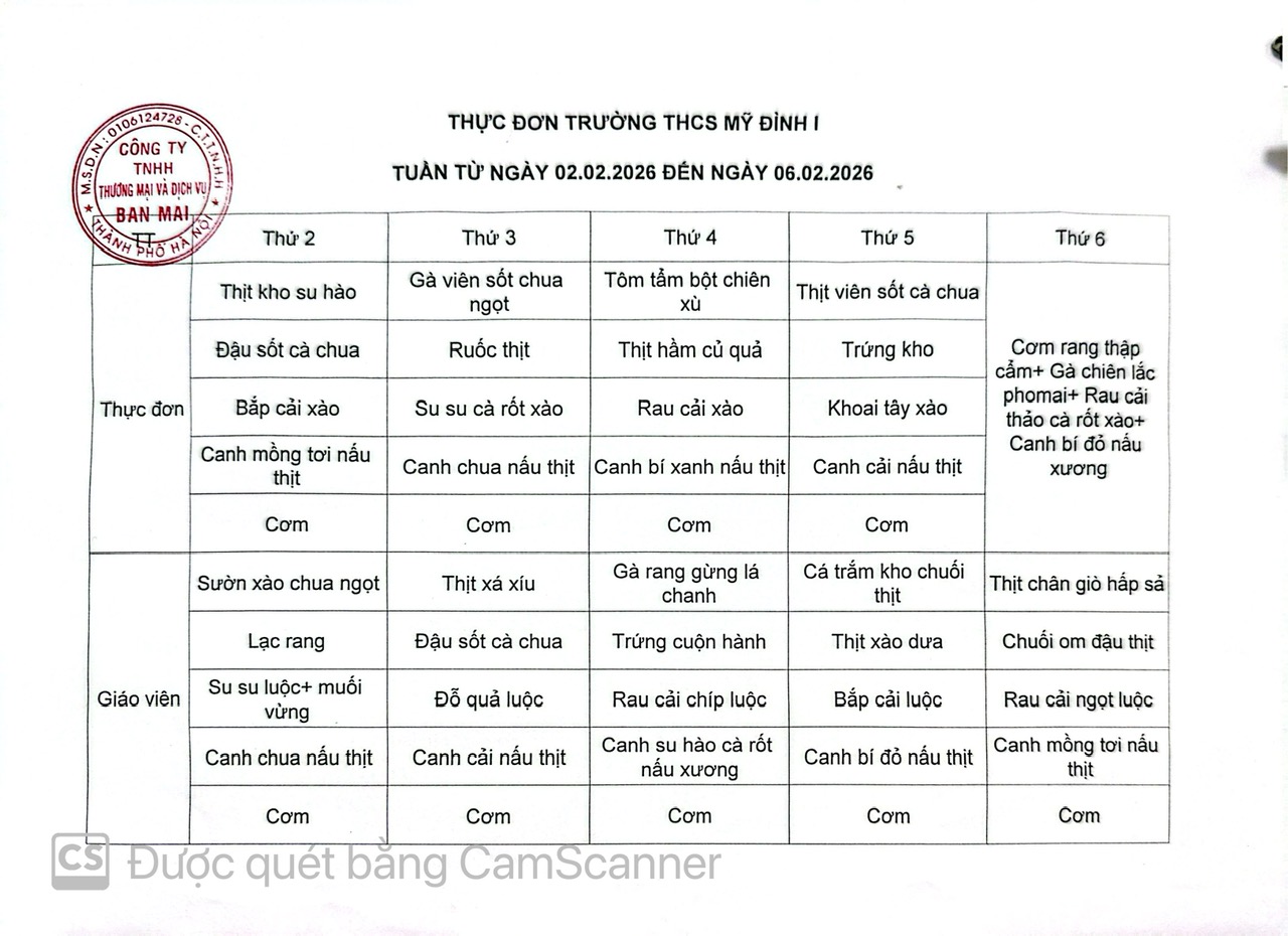 Thực đơn bán trú từ ngày 2/2/2026 đến 6/2/2026