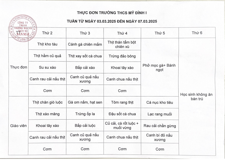 Thực đơn bán trú tuần từ ngày 3/3/2025 đến 7/3/2025